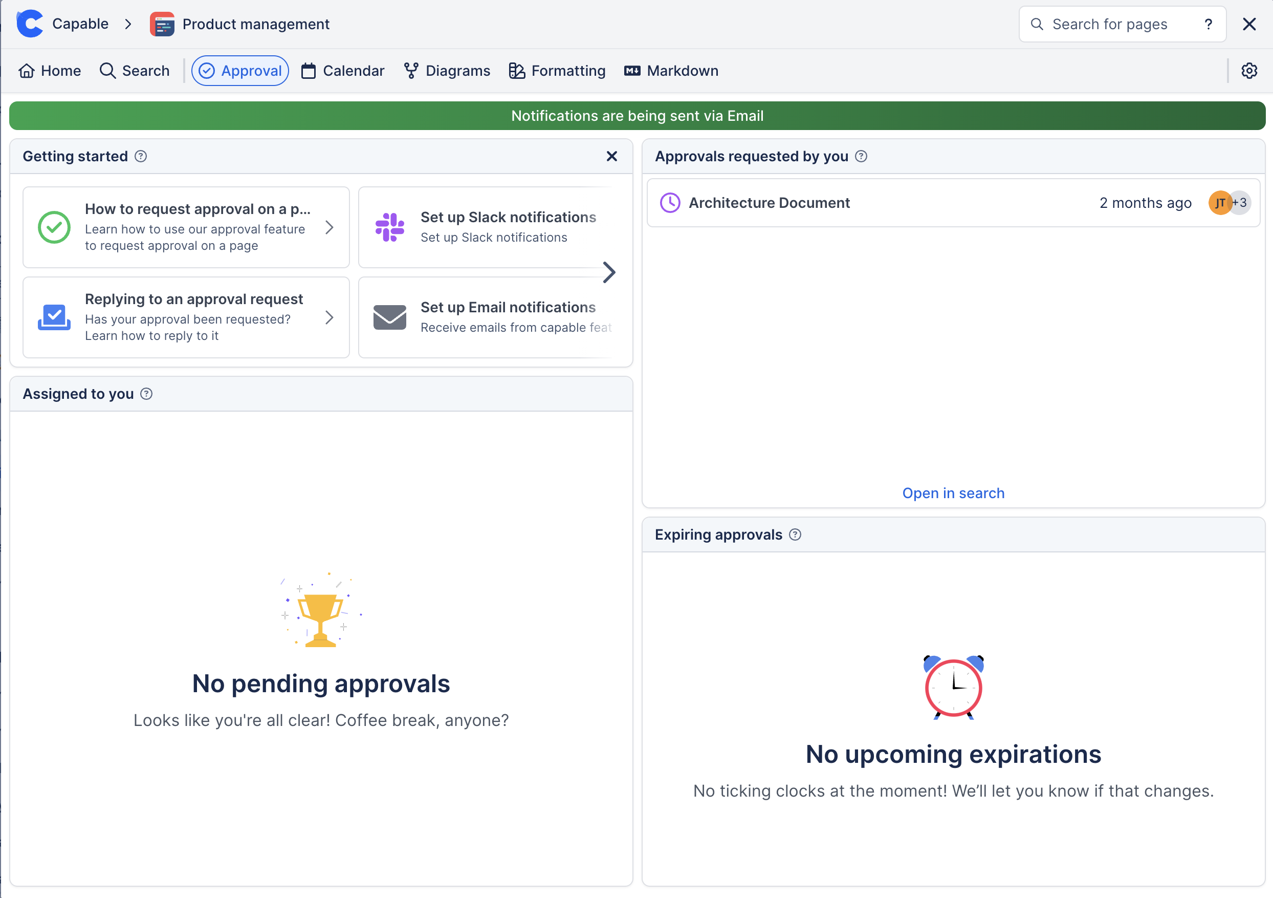 Scattered feedback and decentralized approval workflows lead to confusion and wasted time. With Capable Approval, every comment, input, and decision lives in one place. Slack and email integrations keep everyone notified without creating new silos, allowing for streamlined communication without endless message chains. By consolidating feedback and approval statuses within Confluence, your team spends less time searching for lost information and more time moving projects forward.
