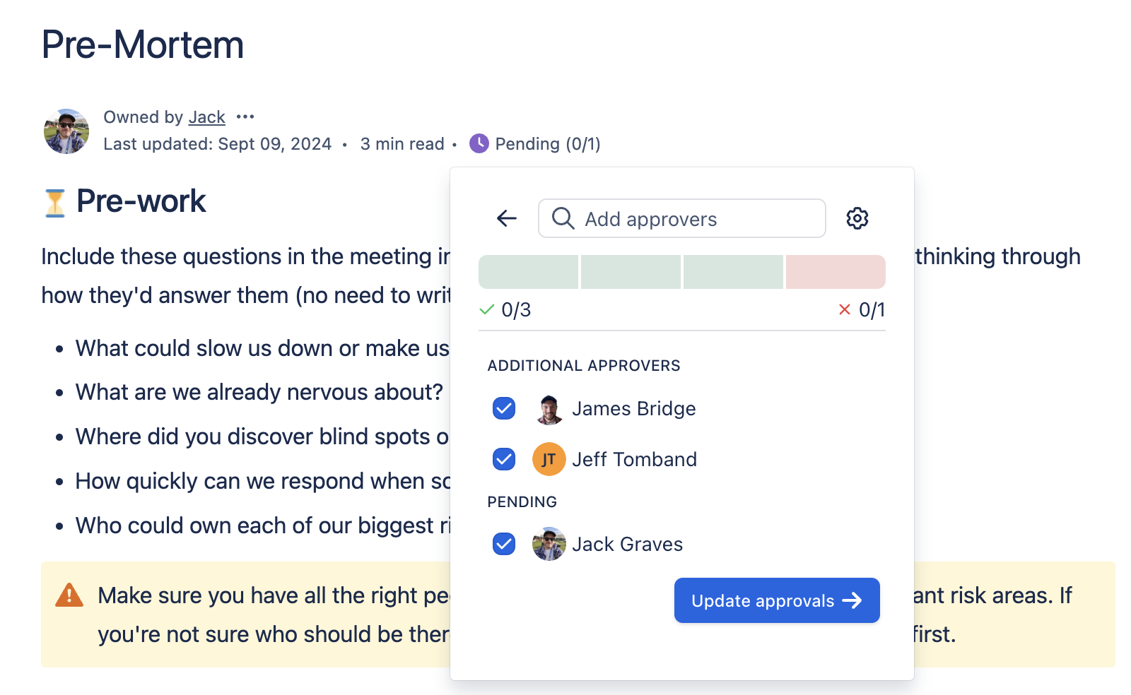 - Centralized Tracking: All approvals are managed within Confluence, where teams have a clear view of pending and completed approvals, eliminating the need to chase down status updates.