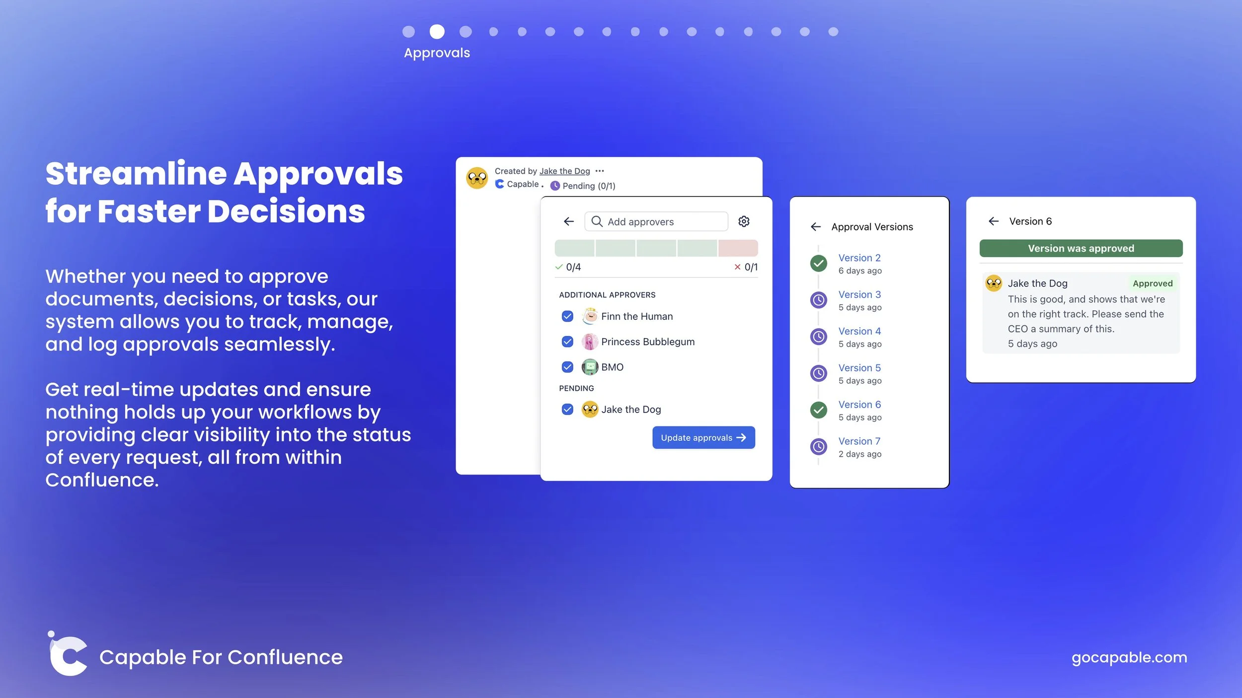 At Capable, we’ve taken all of these challenges into account, crafting Capable Approval as a solution designed directly within Confluence to tackle these common pain points head-on. After listening to stories like Sarah’s, Lee’s, and Dr. Maya’s, we realized that effective approval management requires much more than simply assigning tasks. It demands a centralized, efficient, and transparent process that keeps teams on track and motivated.