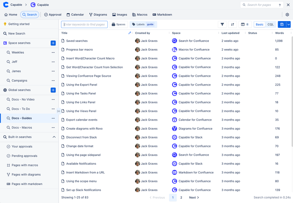 Capable let us customize our search results just like we do in Jira. We added columns for “Last Modified By,” filtered by spaces, and even used Confluence Query Language (CQL) to fine-tune results. Suddenly, finding the right page felt less like a scavenger hunt and more like… well, actually using a search tool that works.
