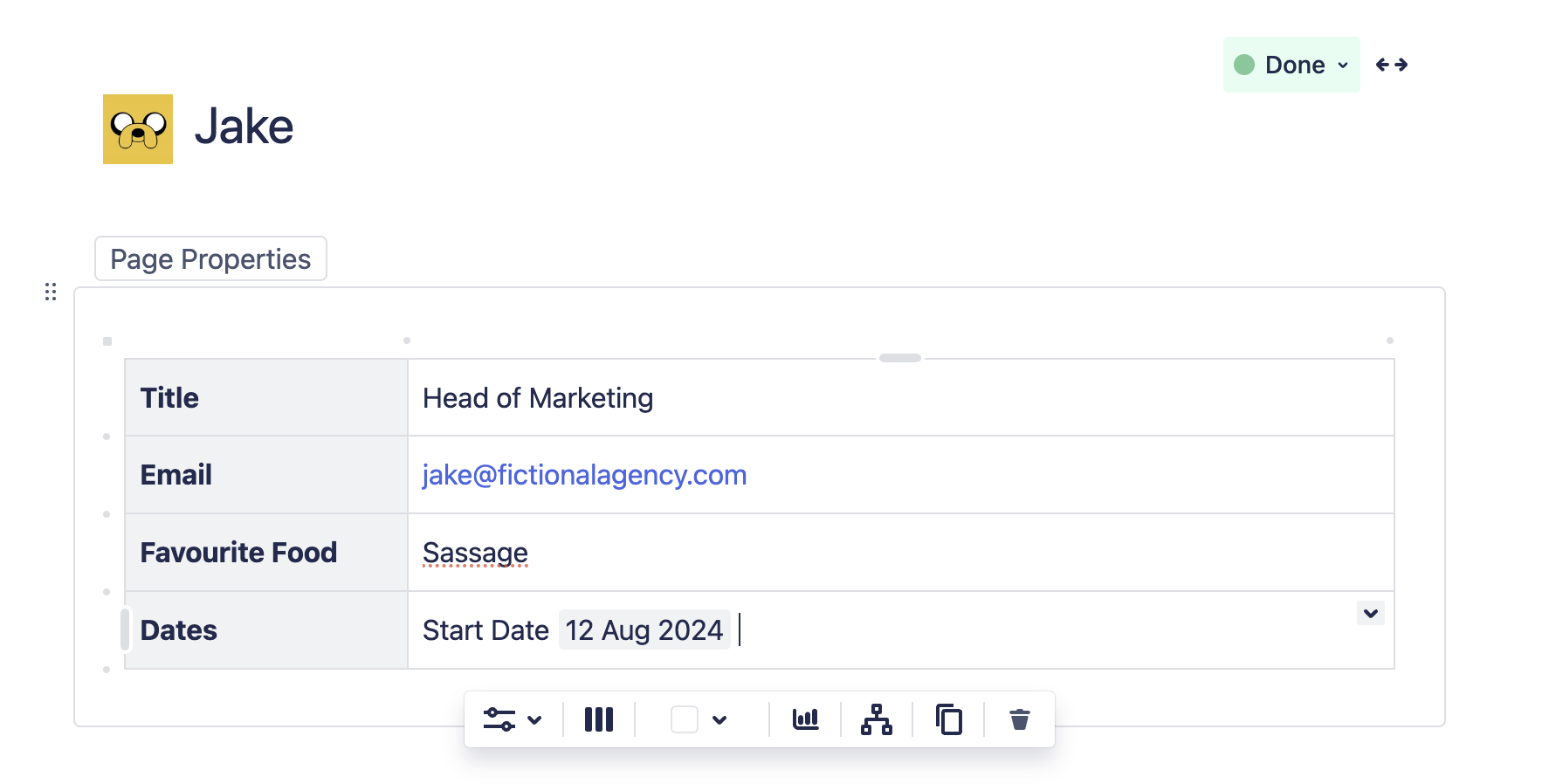 /page propertiesto insert the macro. - Inside the macro, create a table. The first column will contain your field names (e.g., "Project Status", "Owner", "Due Date"), and the second column will contain the corresponding values (e.g., "In Progress", "John Doe", "August 31, 2024").