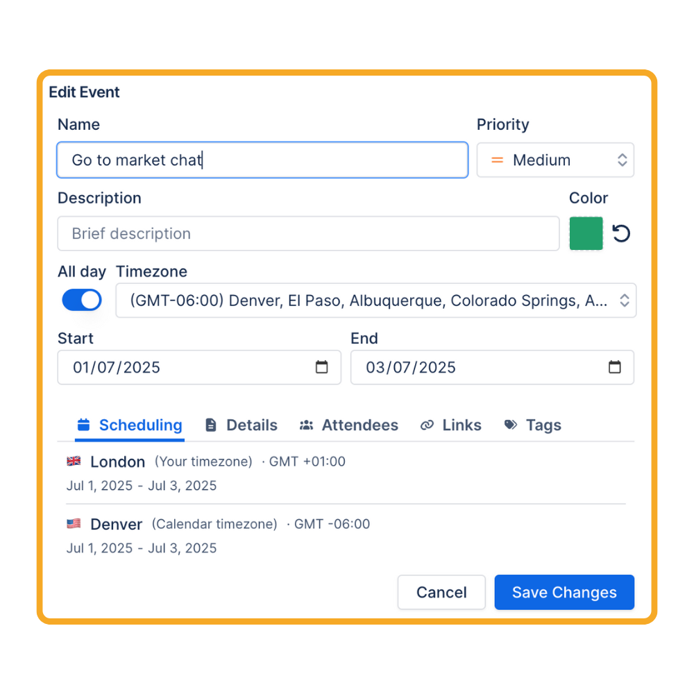 Give events depth. Assign owners, link to related pages, and use labels and filters so teams always see the most relevant view.