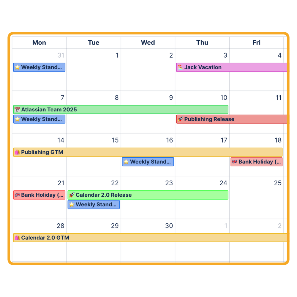 Drop calendars directly into Confluence pages—turning static content into dynamic, time-aware project hubs.