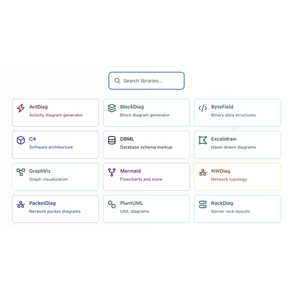 From hand-drawn style (Excalidraw) to Mermaid, PlantUML, C4, GraphViz, DBML, D2 and more—pick what fits the job and your team’s workflow.