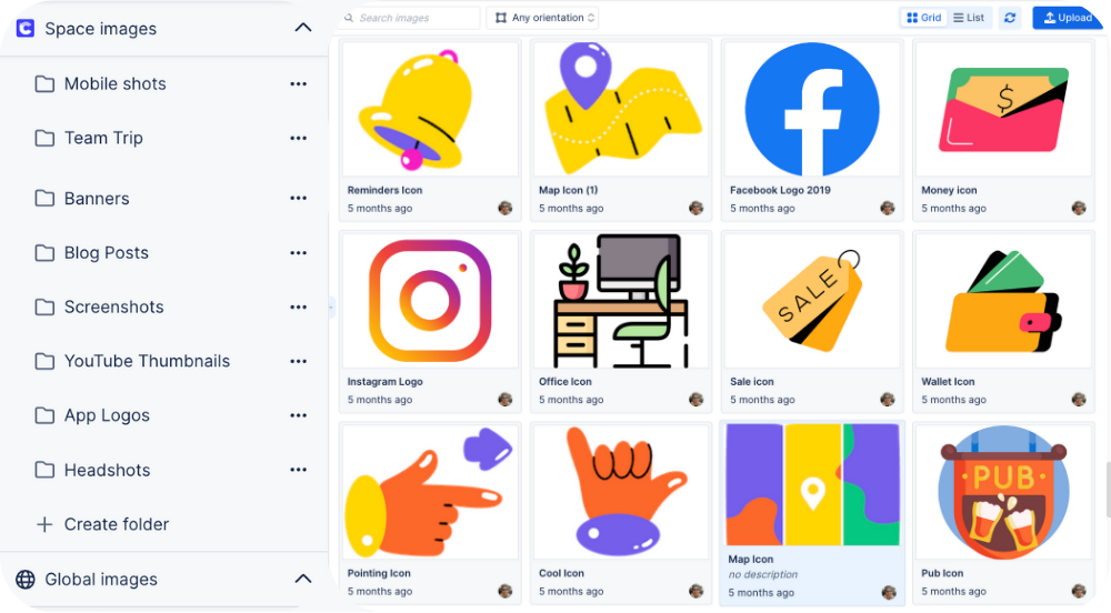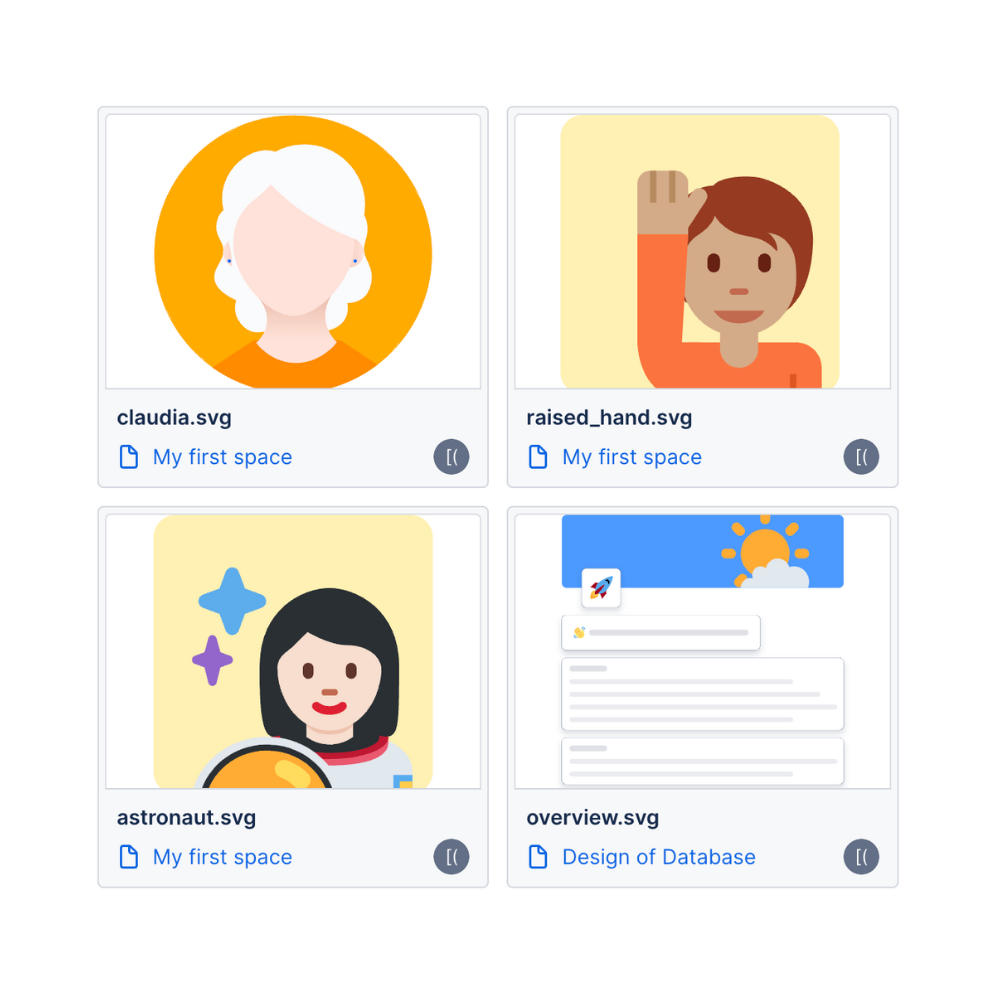 Organize assets globally or per space with folders and metadata, so teams find the right logo, screenshot, or banner fast—even in big instances.