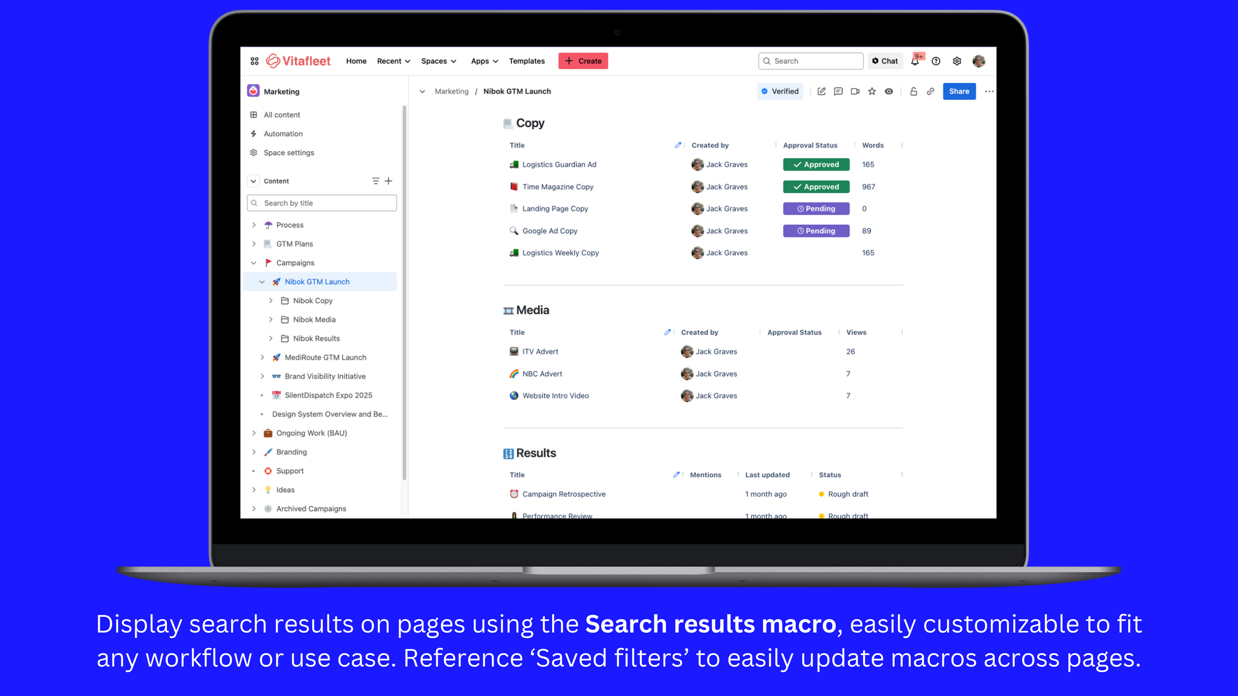 Embed a saved search on any Confluence page to create live, auto-updating lists (e.g., “Recently updated SOPs” or “Pages with macro X”).